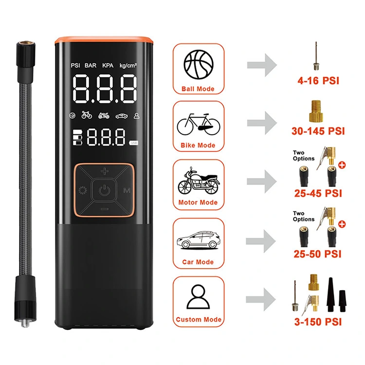 Unità di pressione: PSI, KPA, BAR, KG/CM² e quattro modalità di gonfiaggio preimpostate. È possibile impostare la pressione delle quattro modalità preimpostate in base al proprio veicolo. Questa pompa ad aria è adatta per: